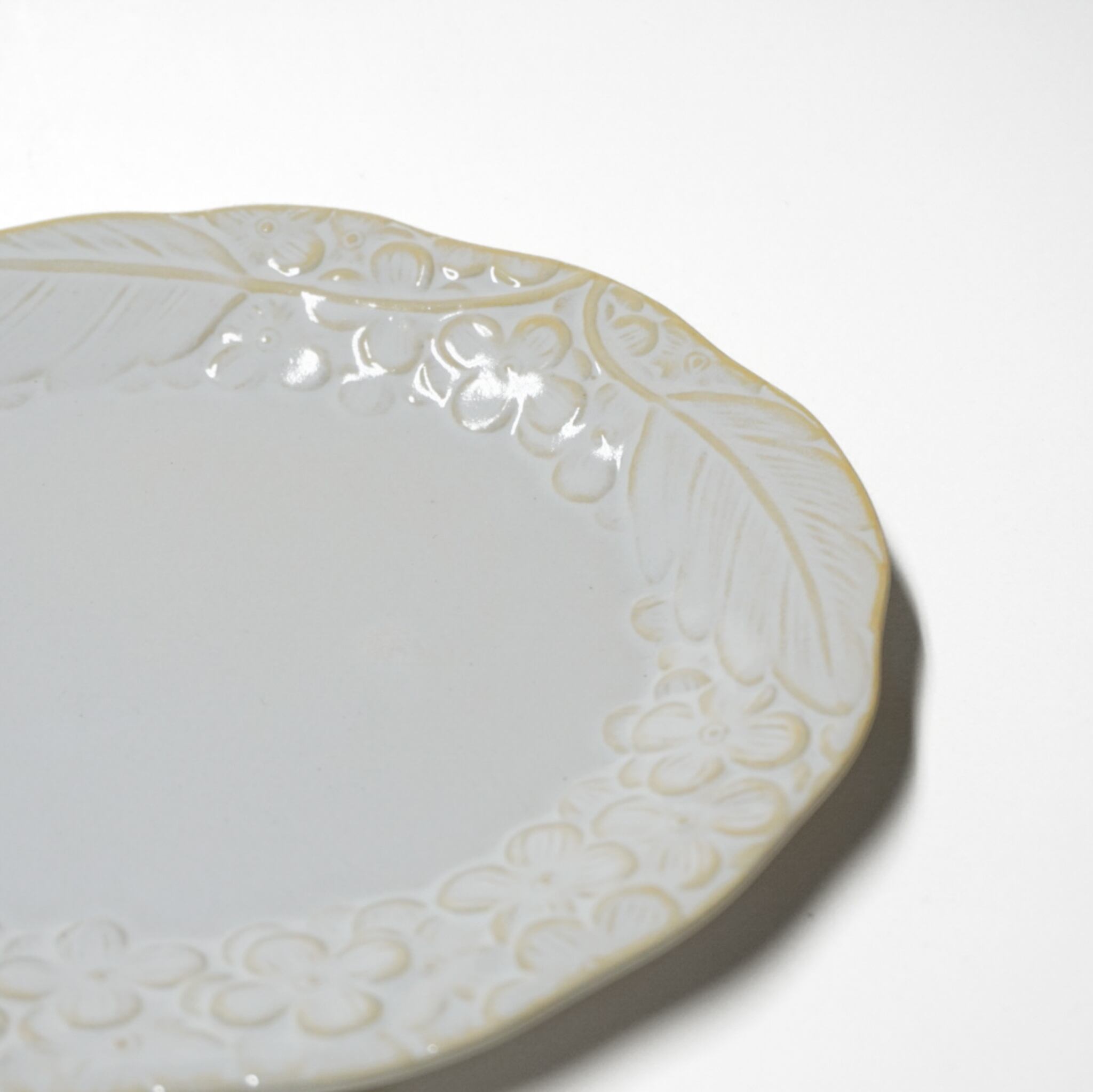 丁寧に彫られたレリーフの花模様と、しっとり落ち着いた色の器がテーブルシーンを優雅に演出します。