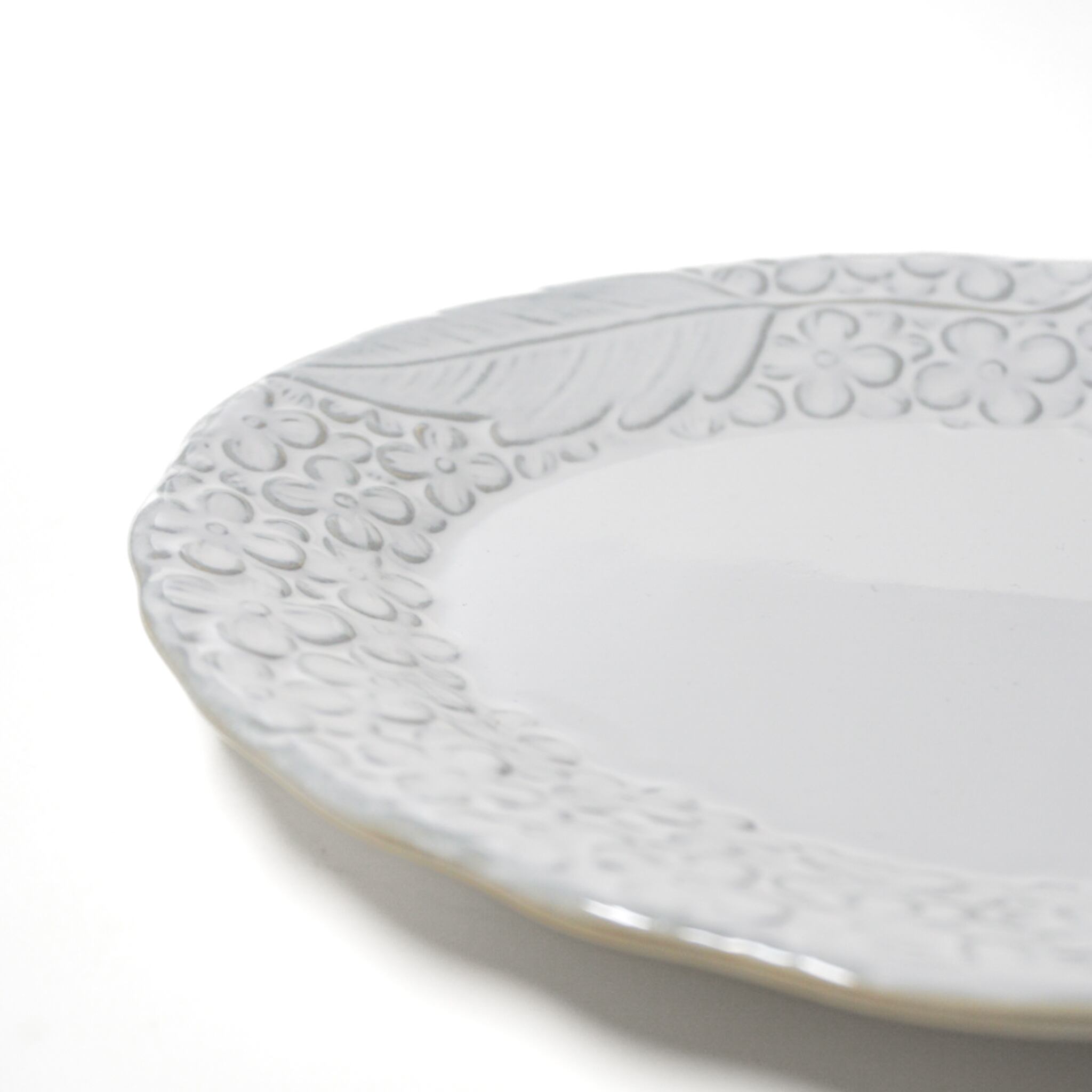 丁寧に彫られたレリーフの花模様と、しっとり落ち着いた色の器がテーブルシーンを優雅に演出します。
