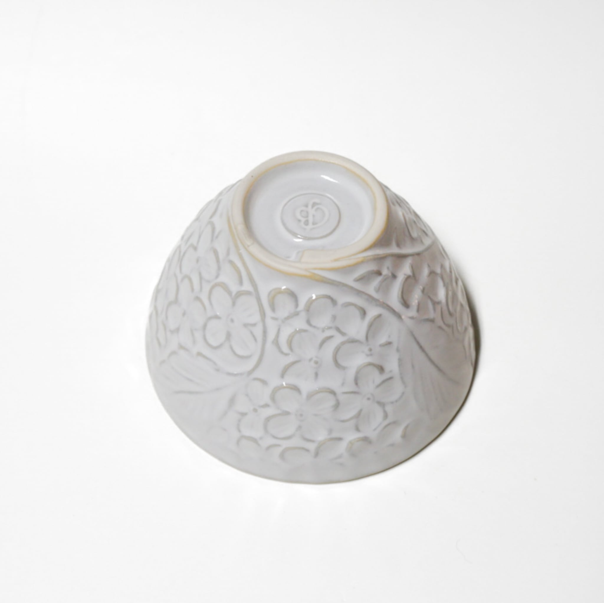 丁寧に彫られたレリーフの花模様と、しっとり落ち着いた色の器がテーブルシーンを優雅に演出します。