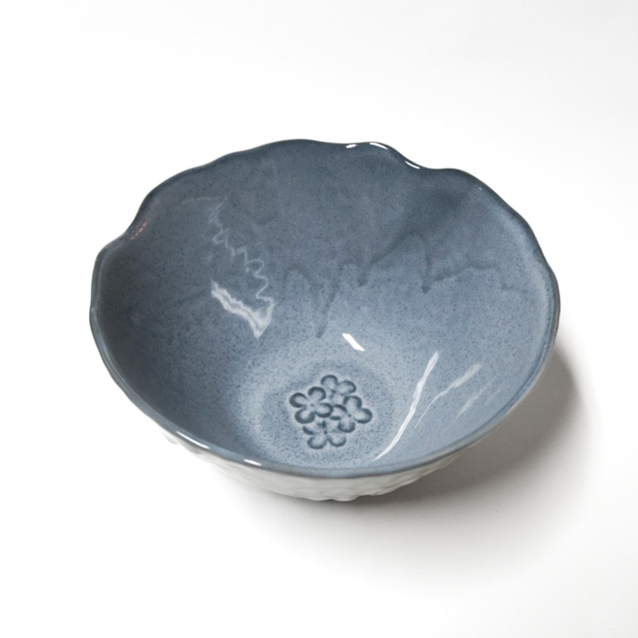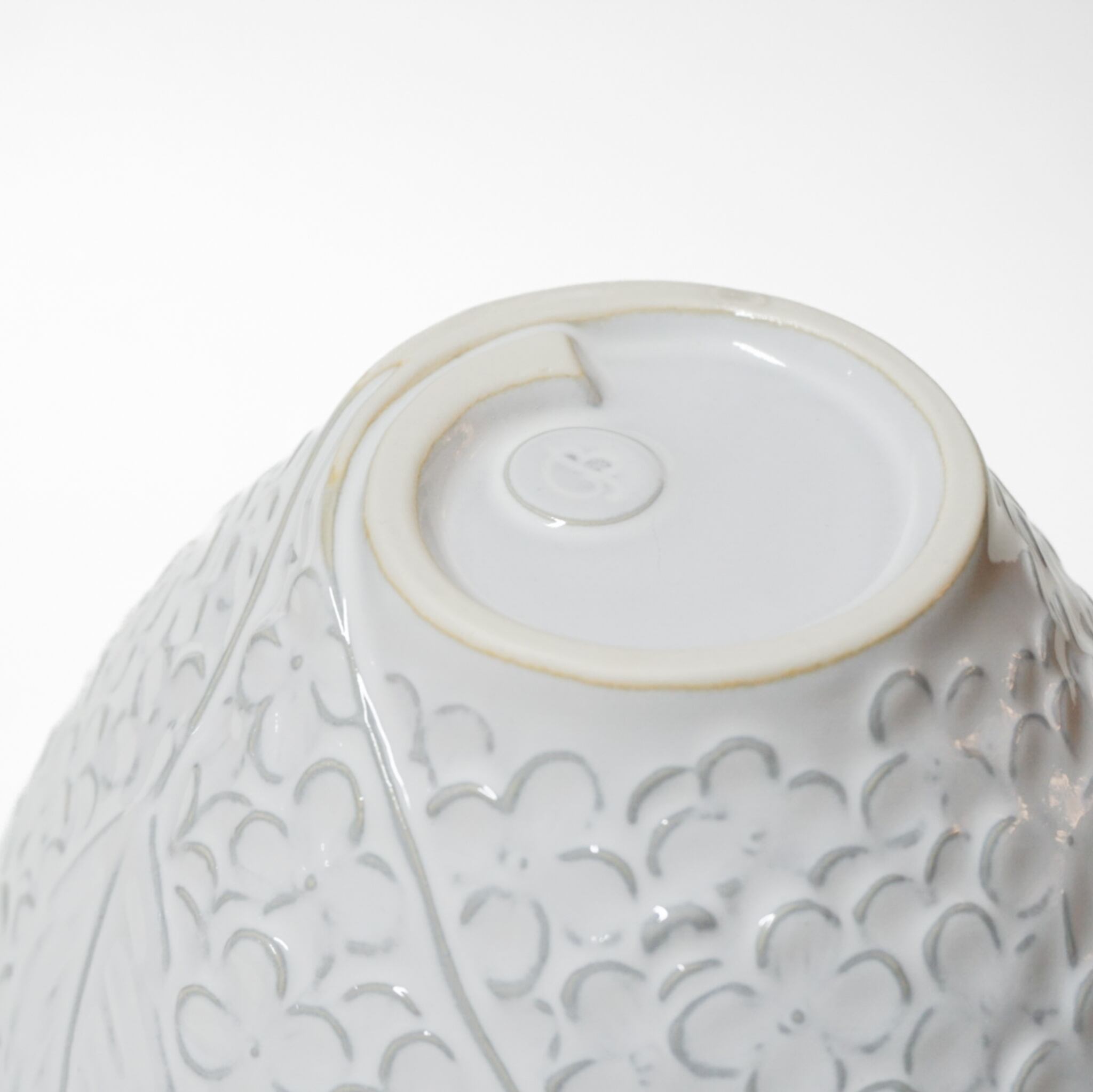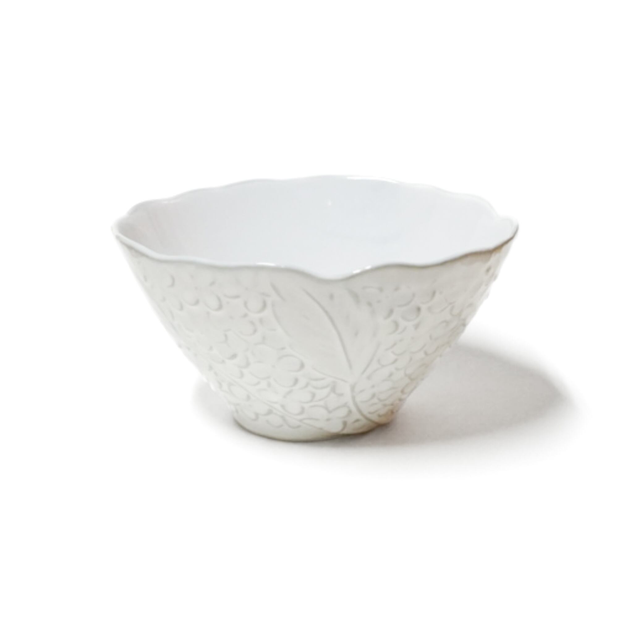 丁寧に彫られたレリーフの花模様と、しっとり落ち着いた色の器がテーブルシーンを優雅に演出します。
