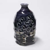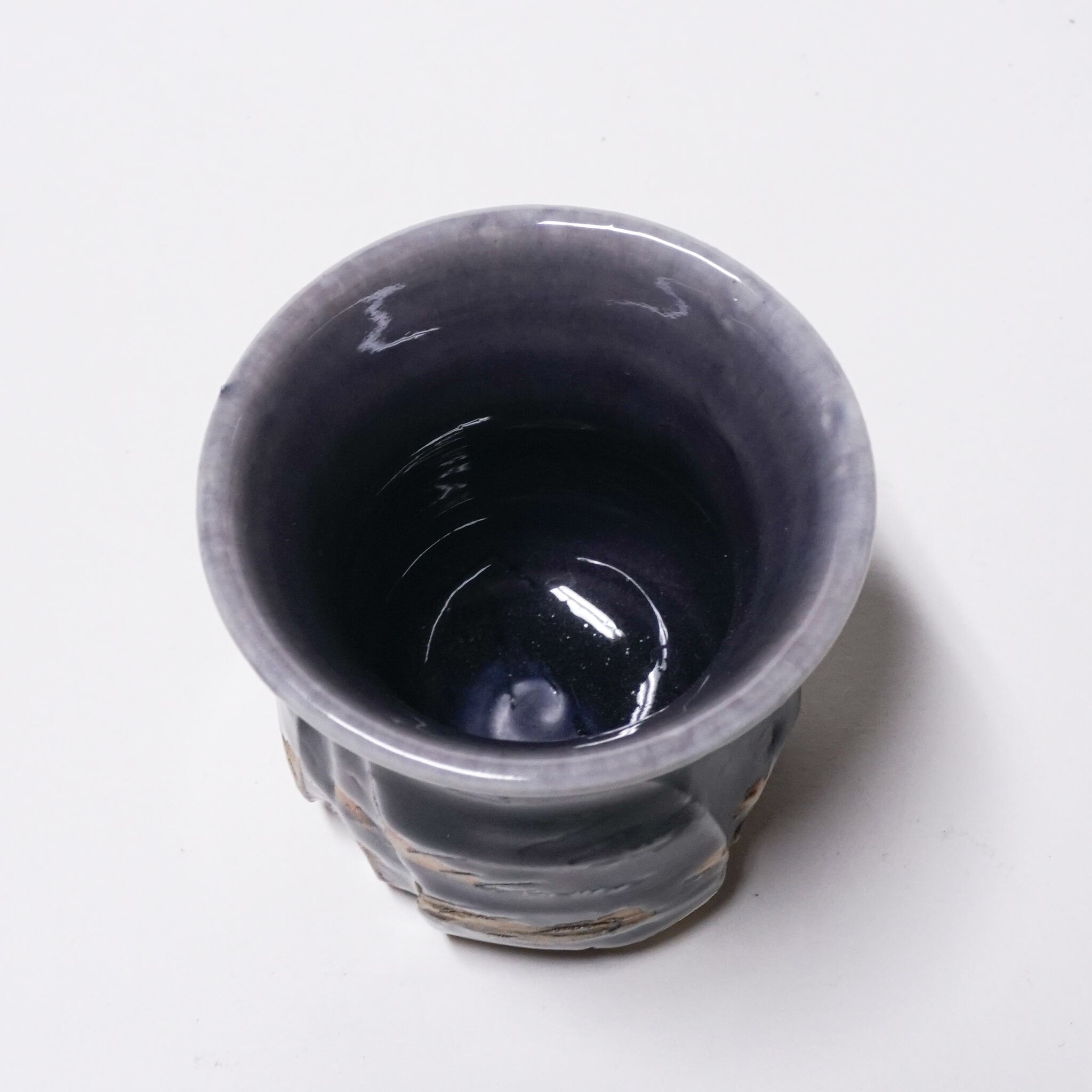 この酒器セットは紫の釉薬の上から、鶴琳窯の特徴的な格子状のモチーフが刻まれています。