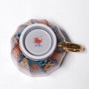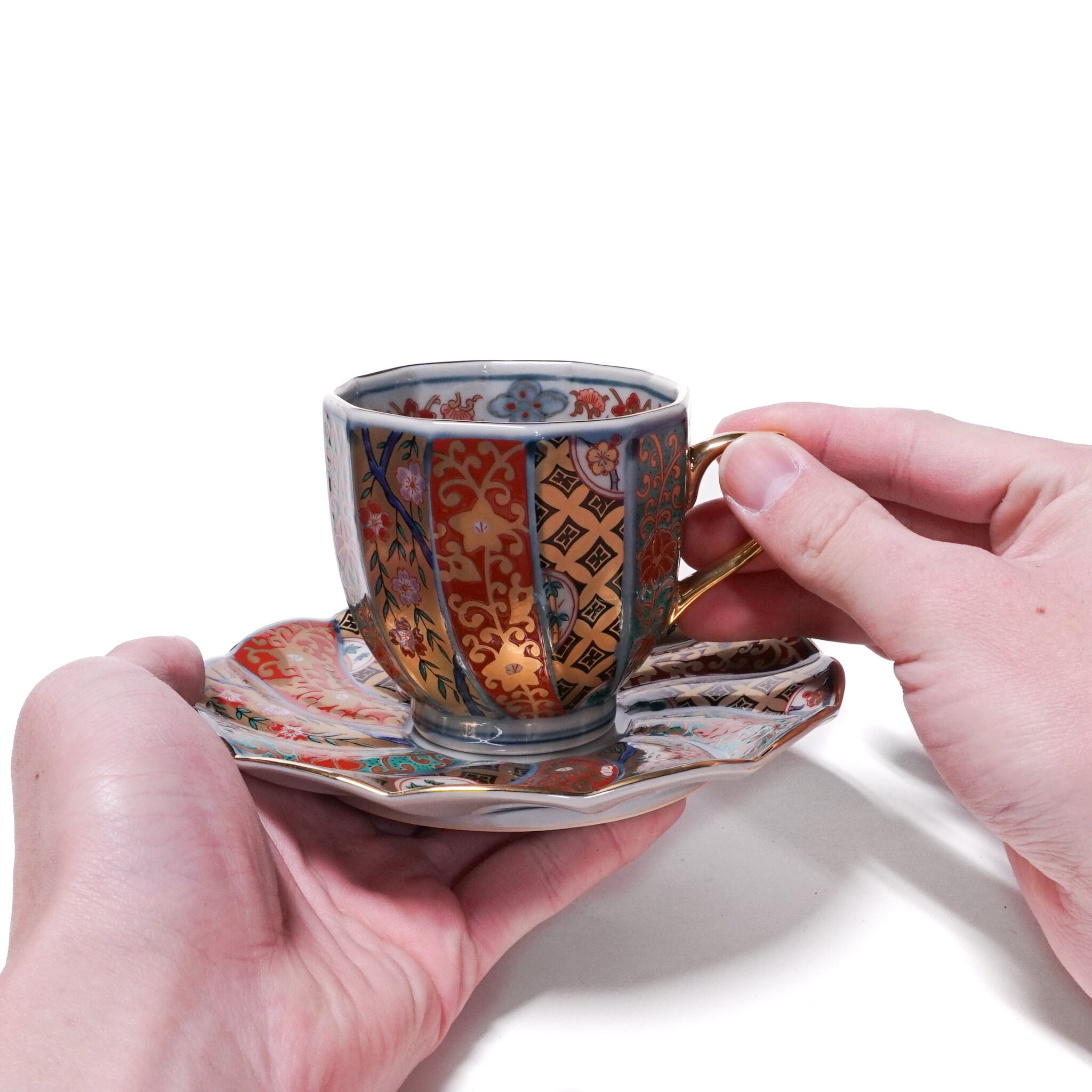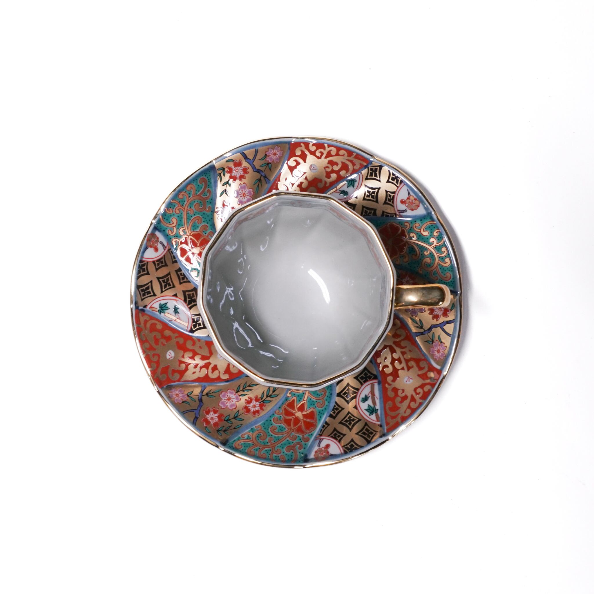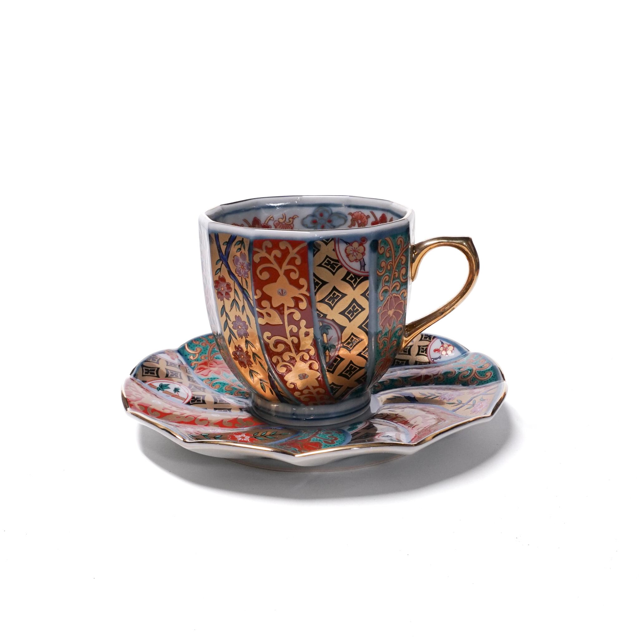 色彩豊かに複数の模様で彩られた珈琲の碗皿セットです。