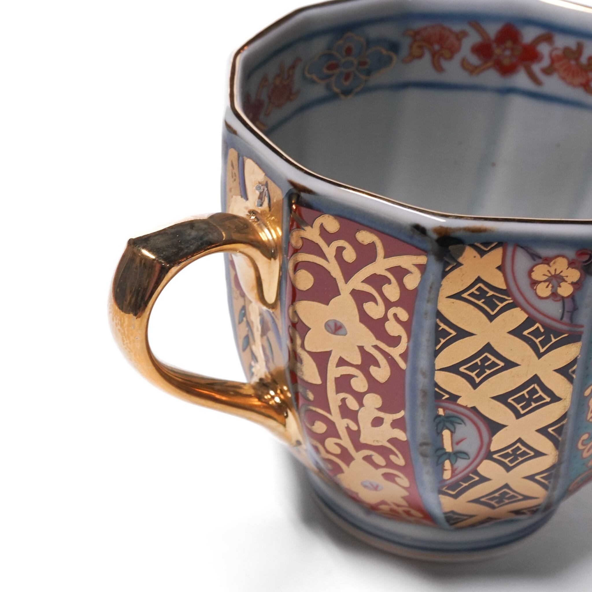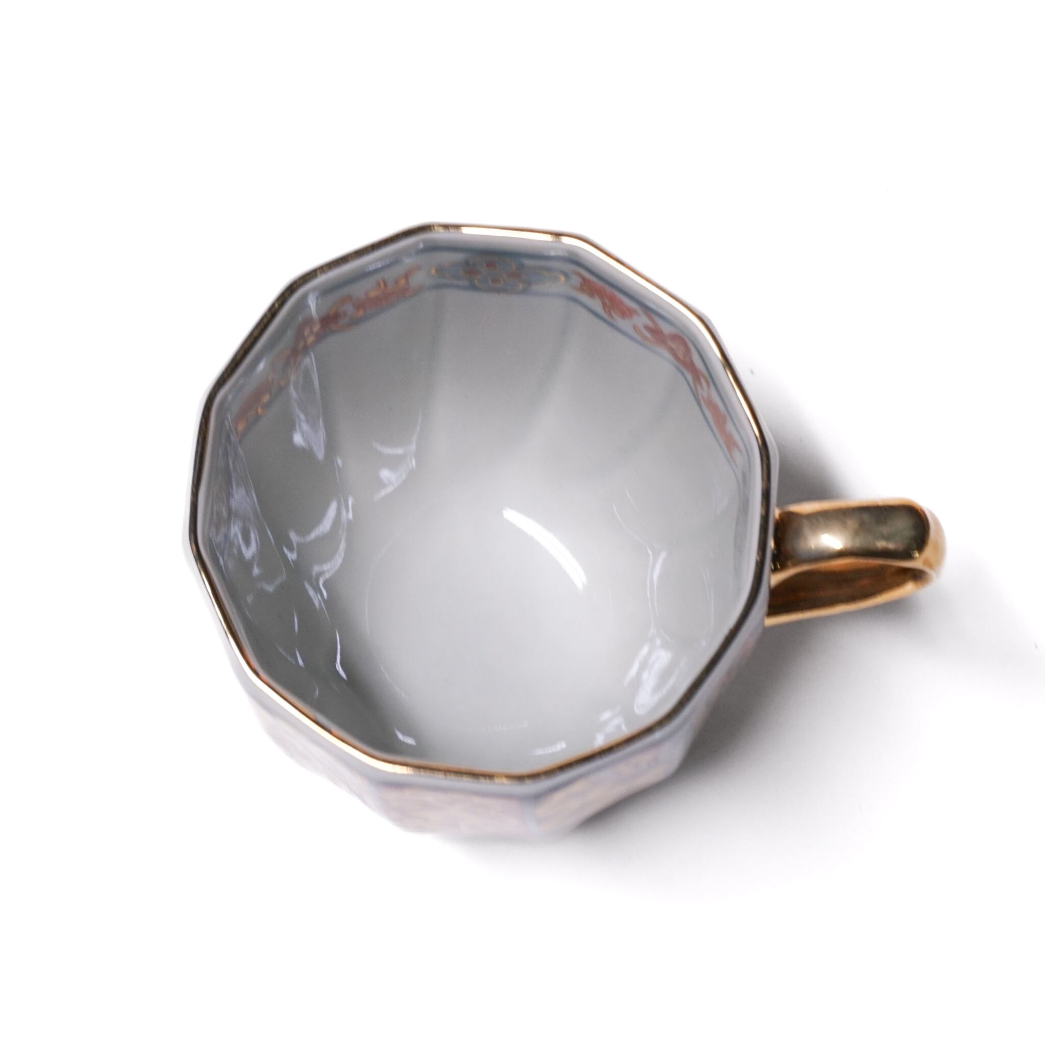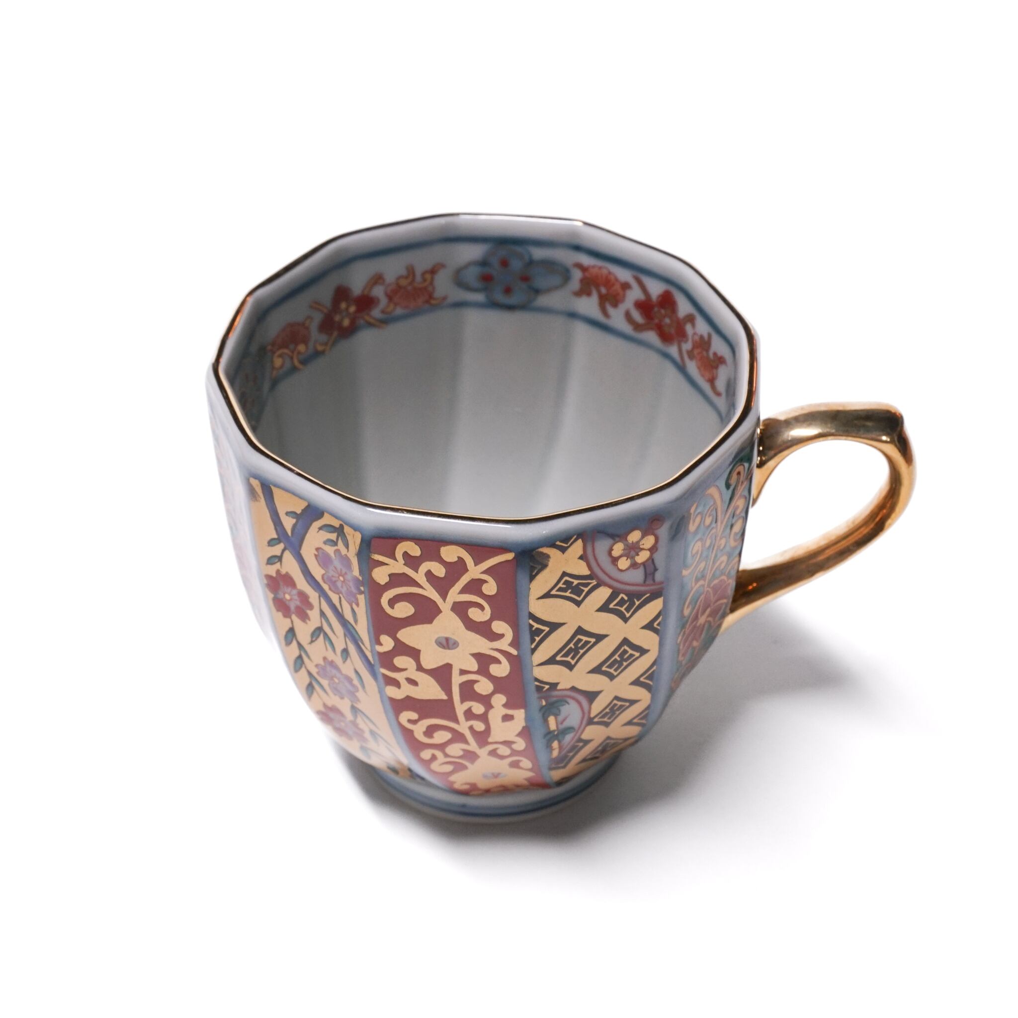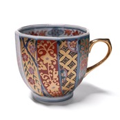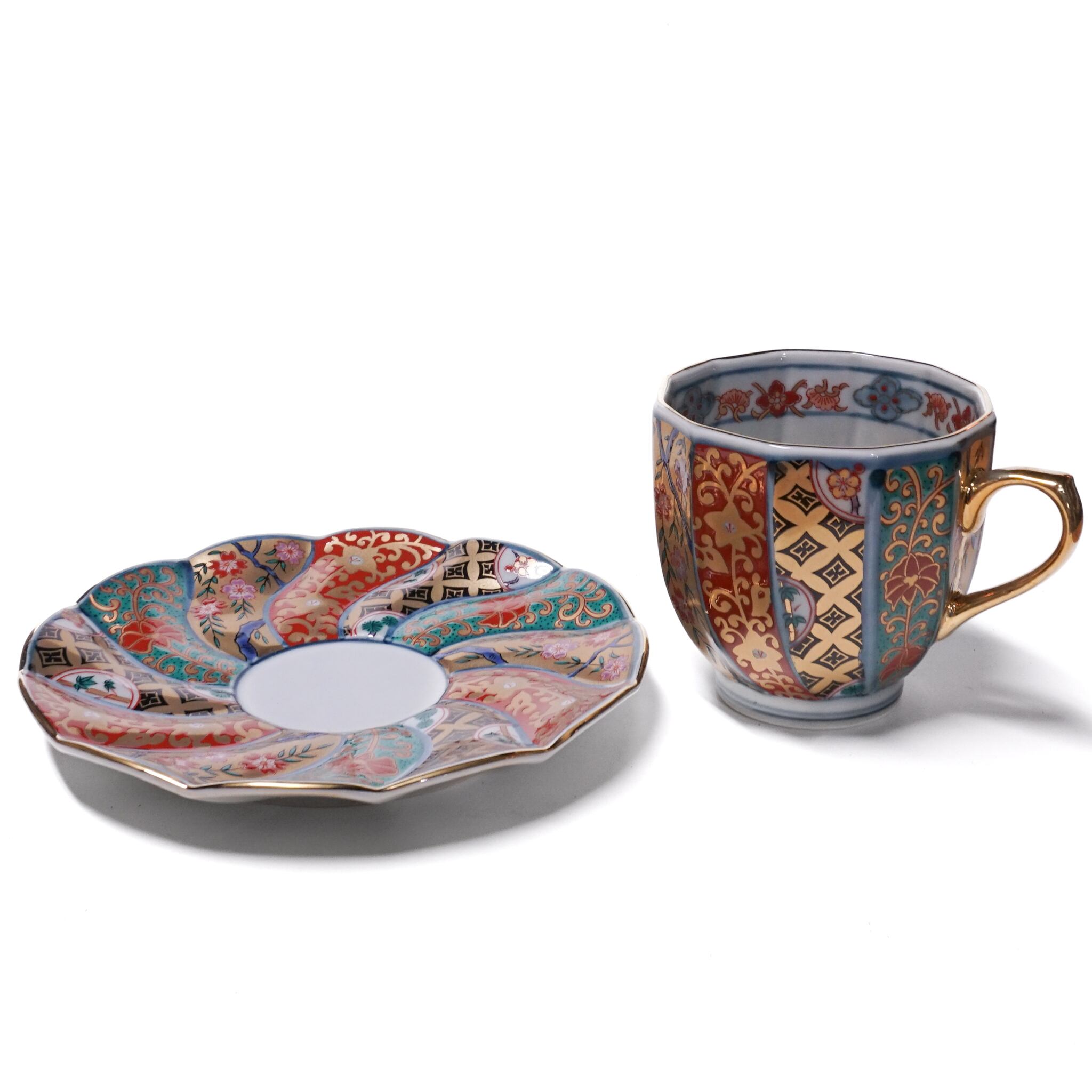 色彩豊かに複数の模様で彩られた珈琲の碗皿セットです。