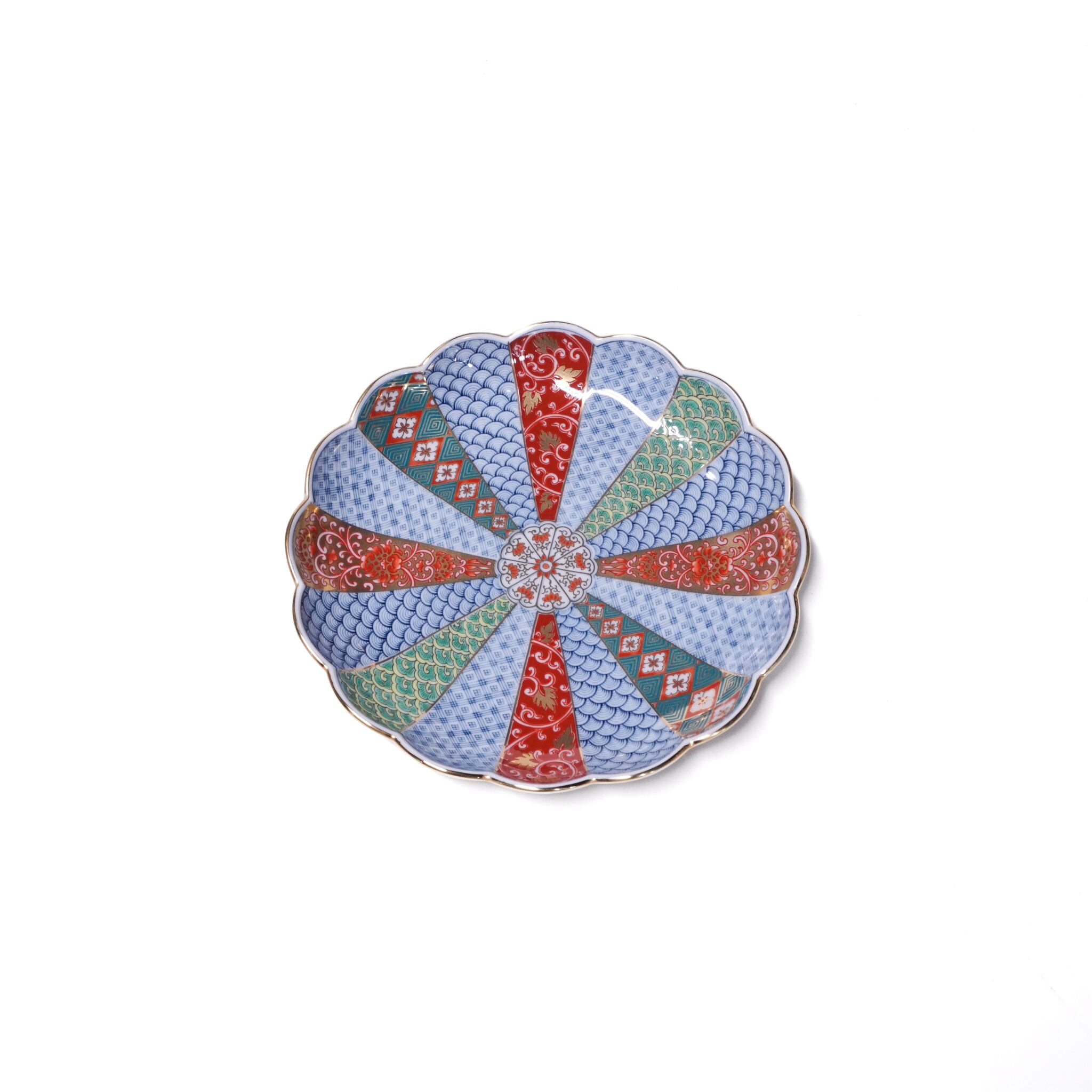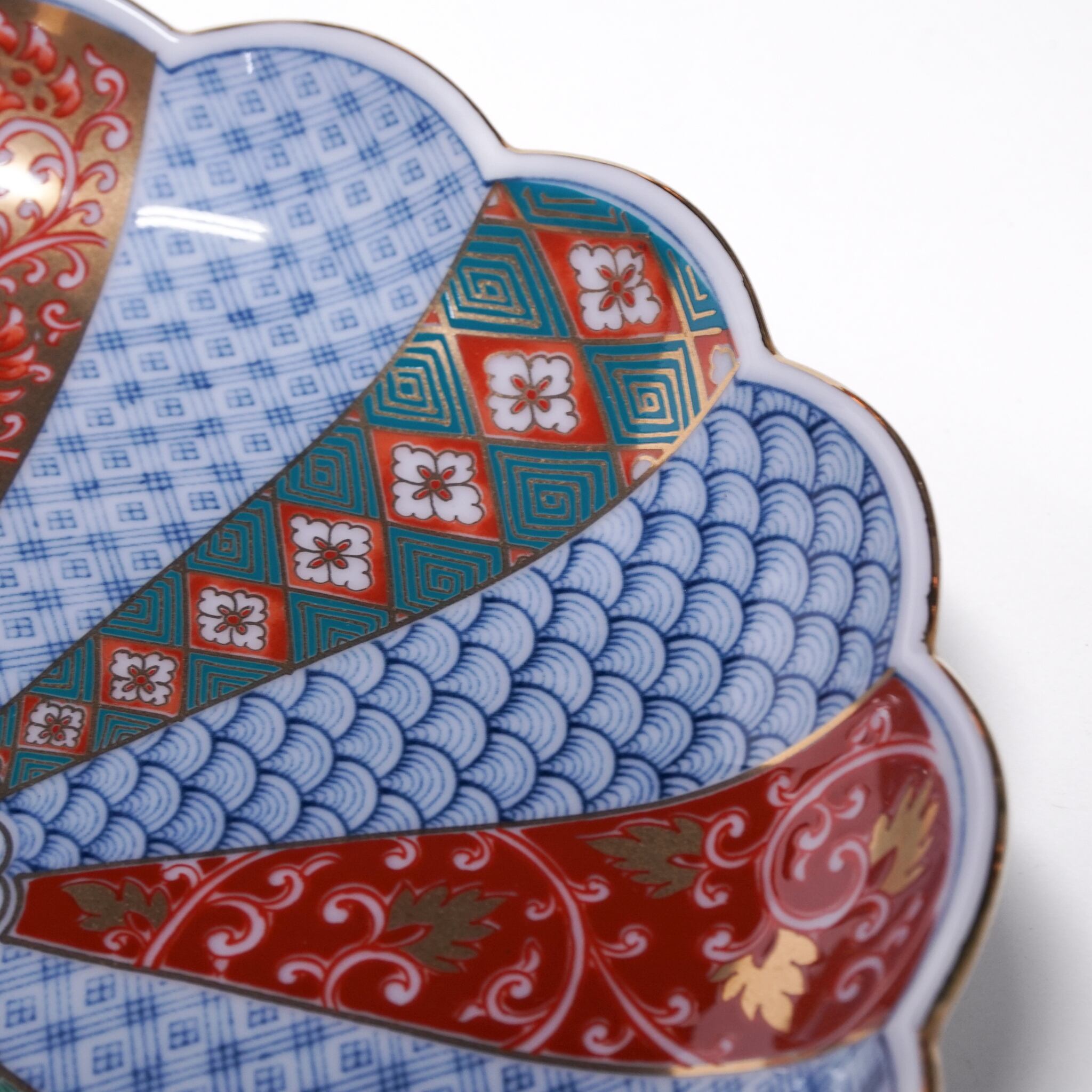色使い、合間の波や格子の模様、中央部分の花、更に金彩で高級感を演出し、飾っているだけでも空間を彩ってくれるうつわです。