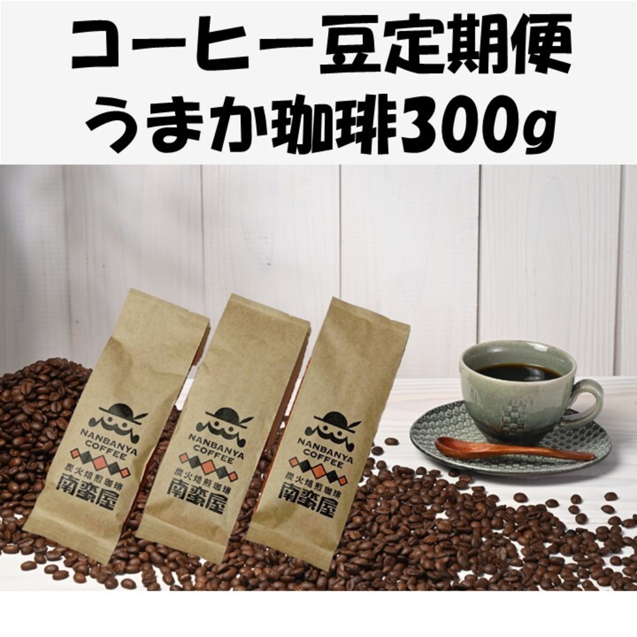 当店おすすめのコーヒー豆であるうまか珈琲300gを、月に一度の定期便でお届けします。
